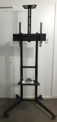 The Brateck Video Cart shown at right can be modified to hold a second 50" screen above the first when space is an issue, with a bit of ingenuity and some muffler clamps, a spare VESA mount, and some steel shelving channels.