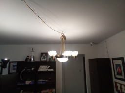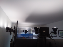 The 8 x 15-watt daylight LEDs (first photo), 4 behind or above the 100" video wall, and 4 mounted atop the two 65" side screens, all reflecting off the ceiling, do a great job illuminating the work area.